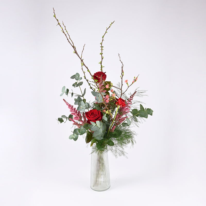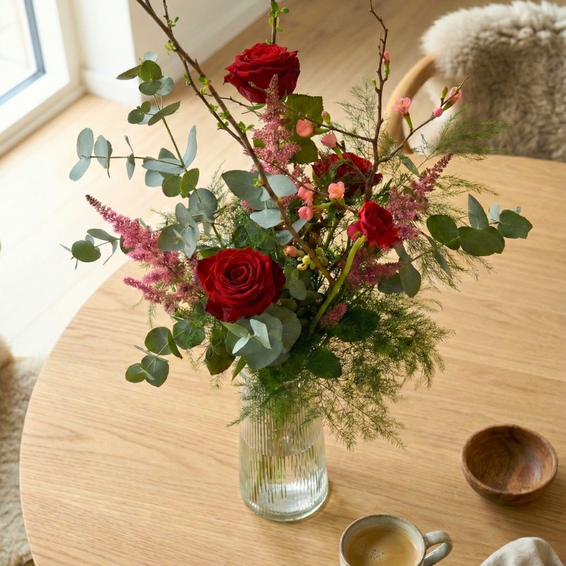 De røde roser fungerer som blikfang og skaber en varm kontrast til de grønne og rå elementer som eukalyptus, bløde grene og grønt. Det luftige design giver buketten en lethed og balance, som gør den perfekt til både designelskere, romantikere og dem, der værdsætter det unikke.