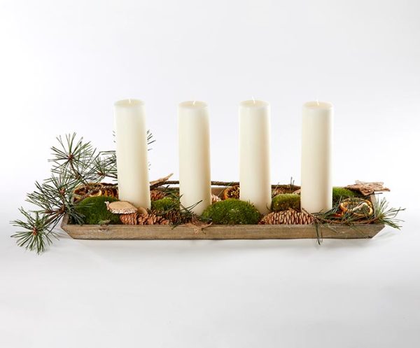 Adventsdekoration med bloklys er den ideelle juledekoration til at skabe en hyggelig og varm atmosfære i dit hjem. Denne dekoration er smukt sammensat med fire dekorative bloklys og naturlige elementer som grønt, kogler og andre sæsonbetonede detaljer, der tilsammen giver et tidløst og elegant udtryk.