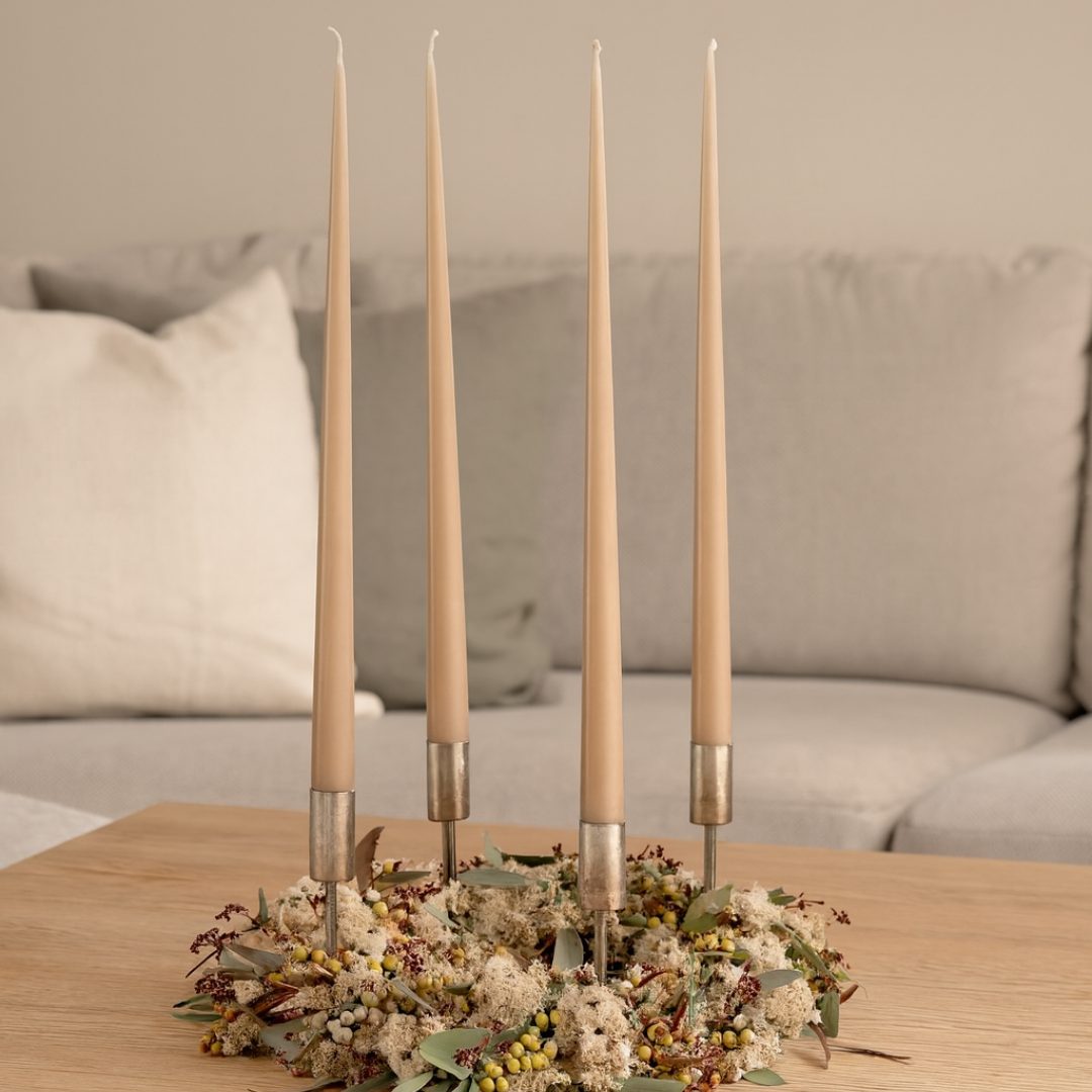 De fire stagelys giver kransen et stilfuldt og tidløst design, der skaber en hyggelig stemning gennem hele adventstiden. Med sit naturlige look og jordnære materialer passer denne adventskrans perfekt til både moderne og traditionelle julehjem.