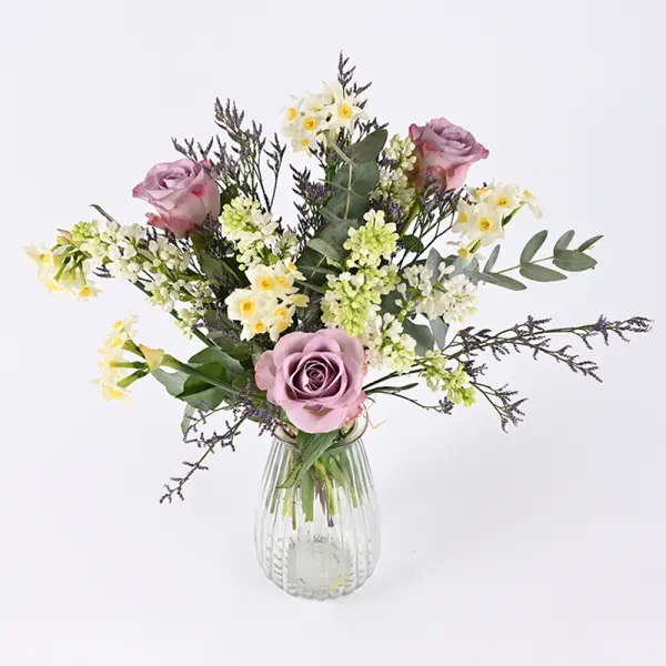 Blandt blomsterne kan du forvente alt fra smukke syrener, roser og sprøde narcisser til friske grønne grene og sarte blomsterhoveder – alt sammen afstemt i en harmonisk og luftig komposition. Buketten passer perfekt som gave til fødselsdag, værtindehilsen eller bare for at sprede glæde og varme tanker til en, du holder af.