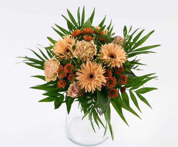 Hver buket bindes af erfarne florister, som nøje udvælger blomsterne for at sikre en harmonisk og elegant sammensætning. Med sin varme farvesammensætning og stilfulde design passer denne buket til enhver anledning og er sikker på at gøre indtryk. Du kan vælge størrelsen og prisen på buketten, så den matcher dine behov og anledning.